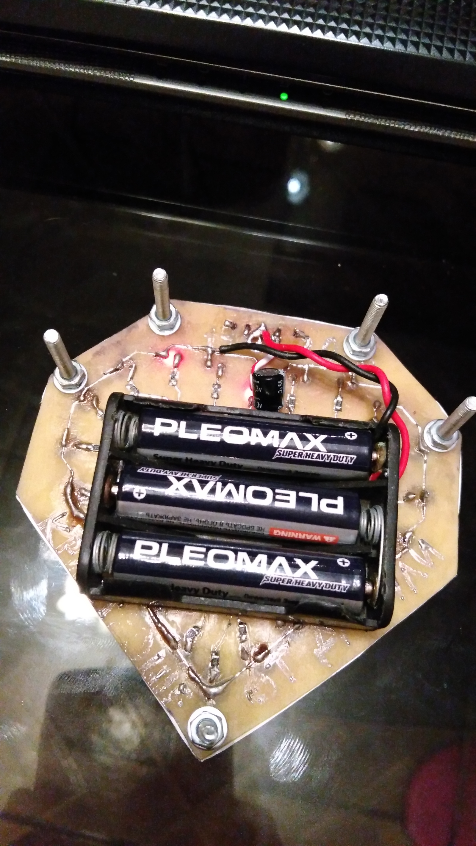Я предполагал сделать питание от таблетки, однако сердце долго не жило на ней, и решил сделать питание на 3 мизинчиковых батарейках, сверху смонтировал выключатель