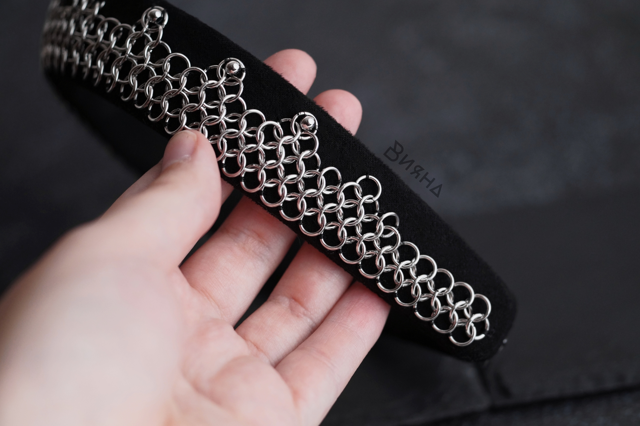 Кольчужное плетение (европейское 4-в-1), нержавеющая сталь. Ткань под замшу. Металлическая часть пришита прочной мононитью.