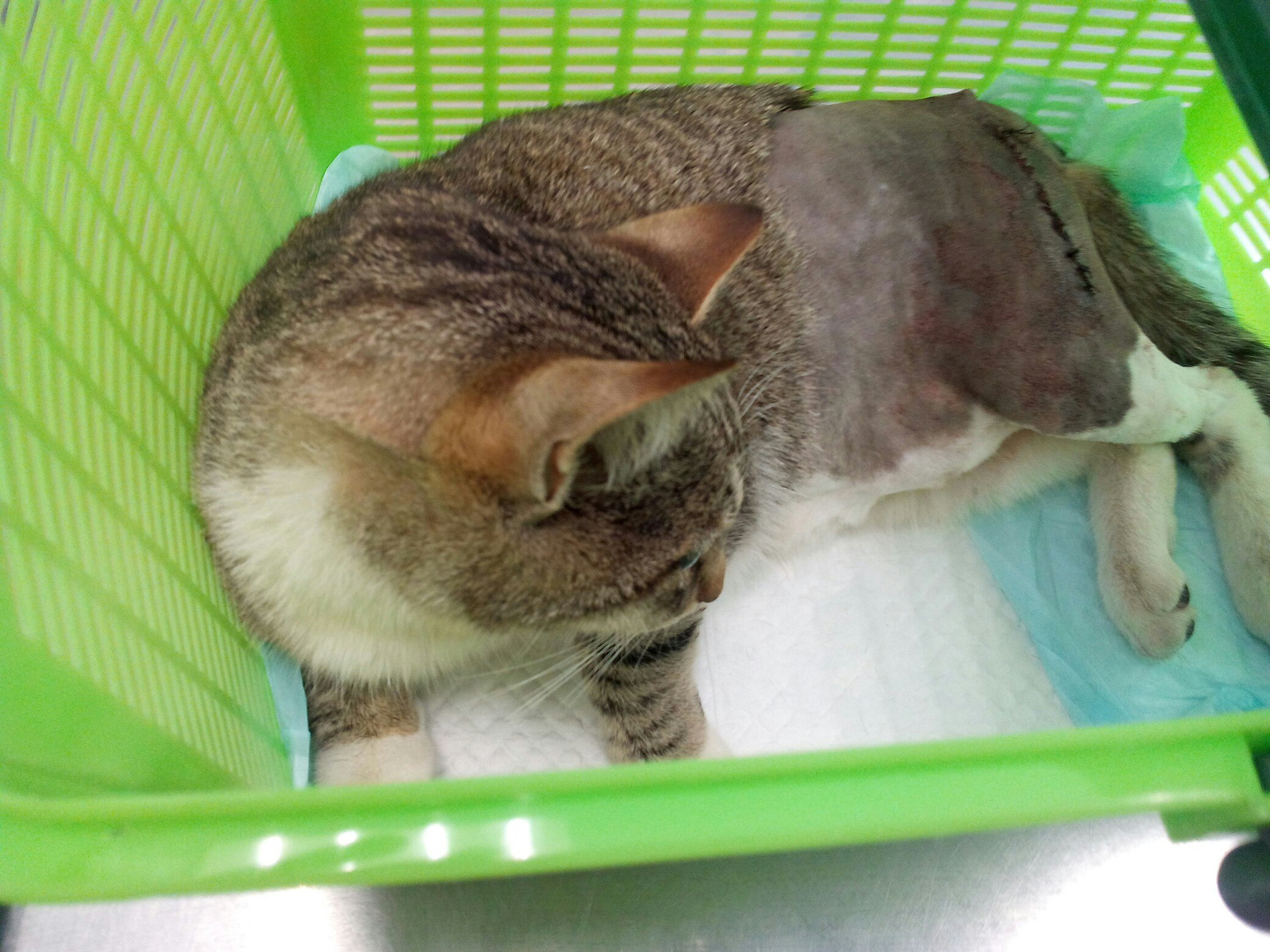 Она тоже попала под машину, у неё гематома на животе и отрыв подвздошно-крестцового сочленения, который срастётся сам, если обеспечить кисе покой.