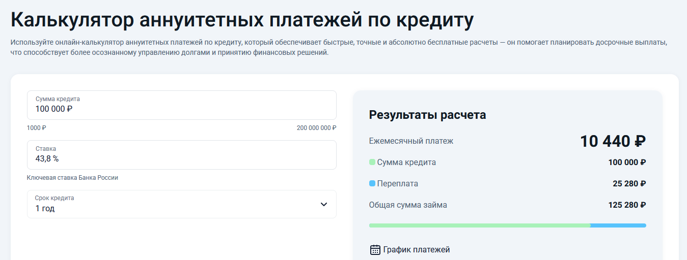 Интересно, каким же образом этот калькулятор насчитал 43.8% при сумме кредита 100000 и переплате 25280 рублей за год?