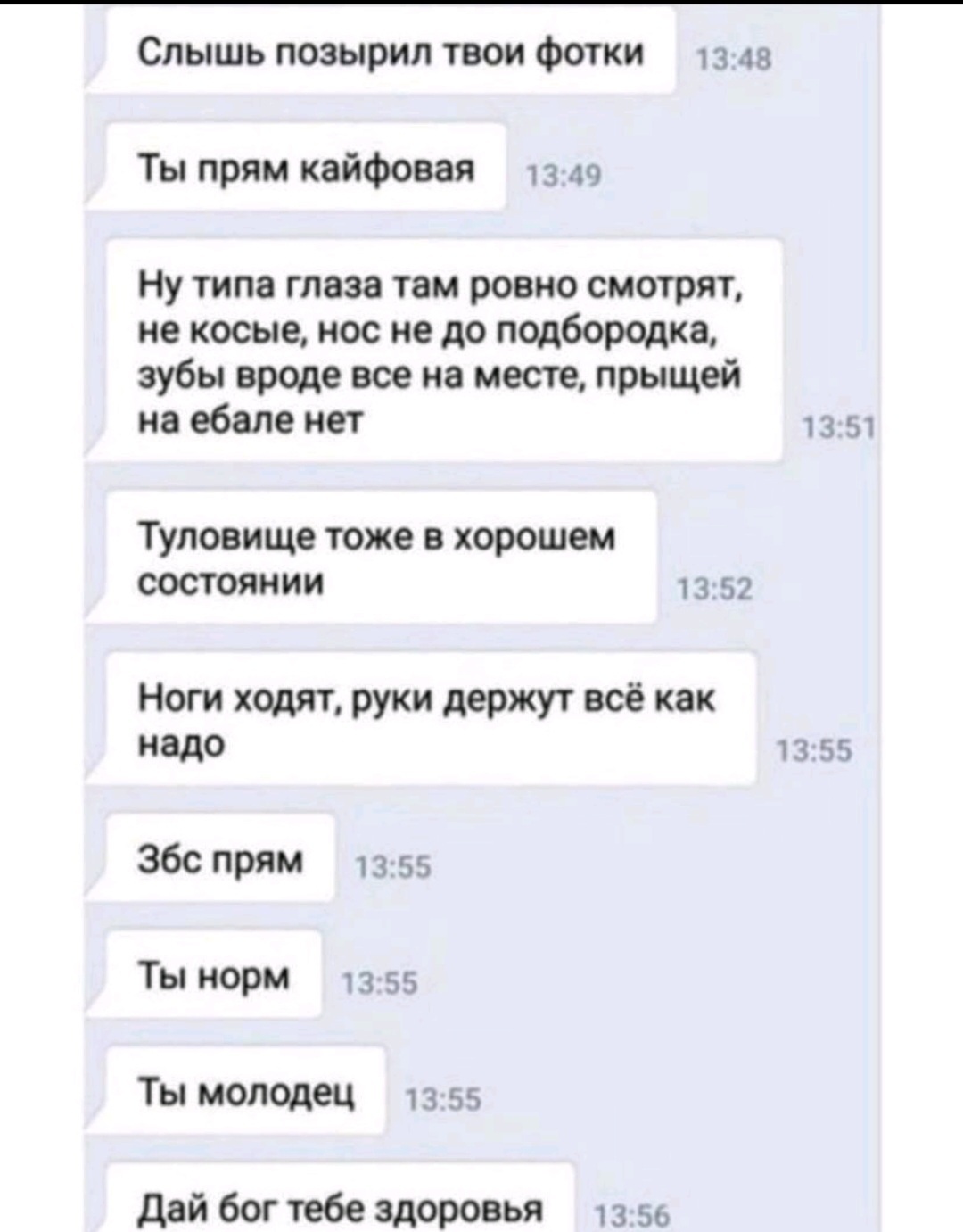 31 pisynKolobka Если и делать комплименты, то только такие)) 6 месяцев назад Мат Юмор Переписка 2 Ещё 0