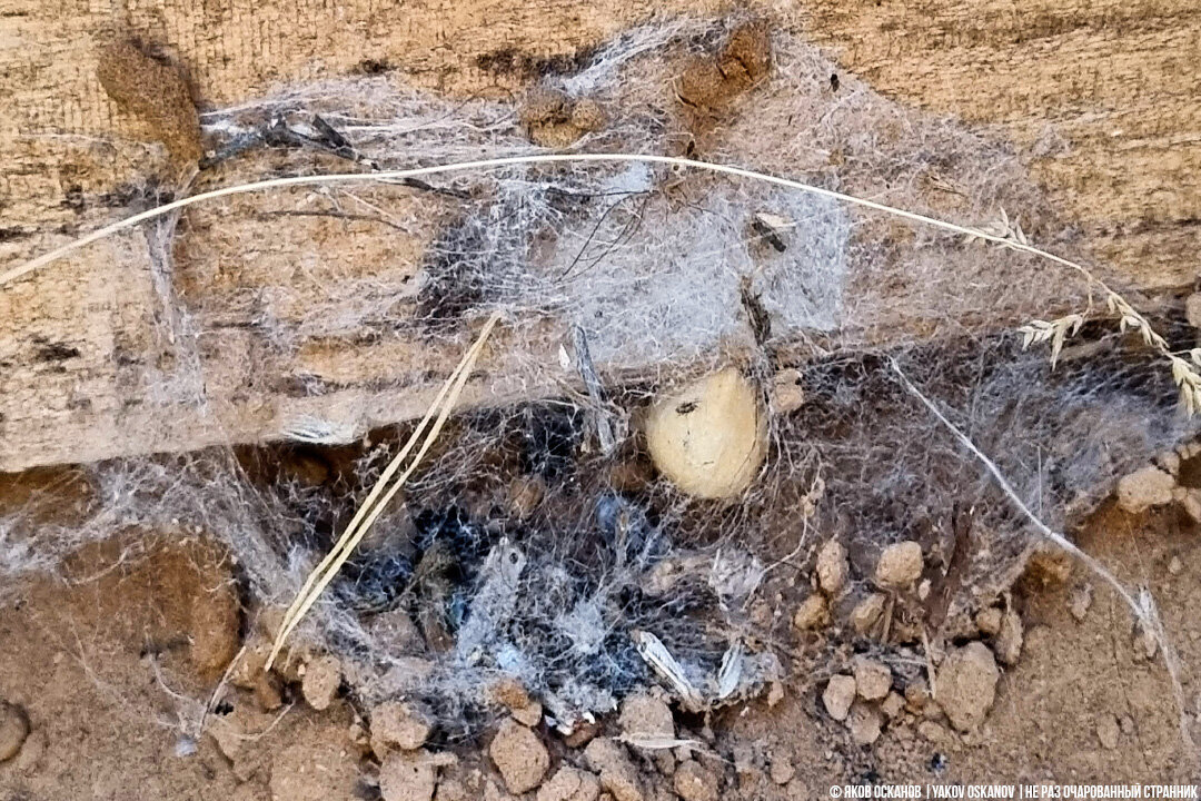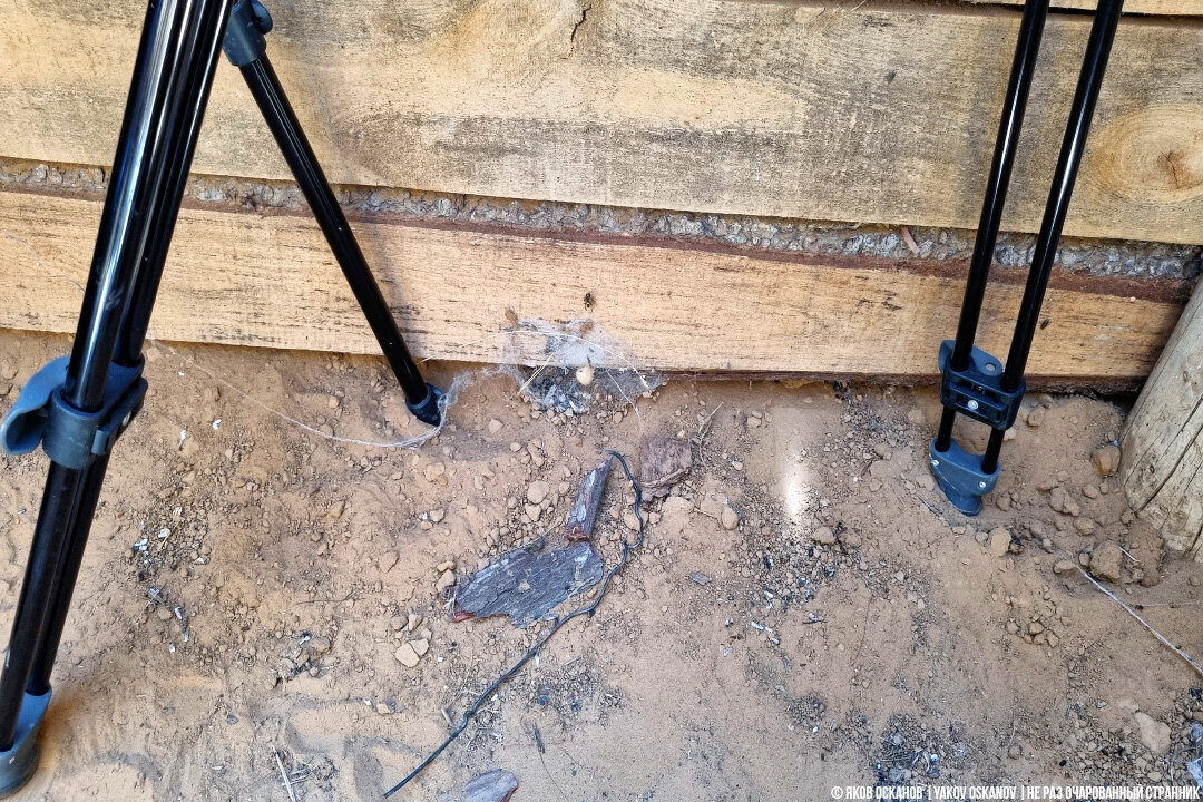 В один прекрасный (или не очень) момент, я обнаружил на земле, прямо между ног наших штативов, куда я ставил свои обутые в босоножки ноги, небольшой белый шарик, обёрнутый паутиной. Я не большой специалист в арахнологии, но понял, что это кокон какого-то паука. Стало любопытно какого.