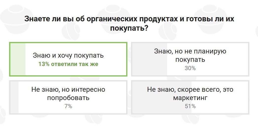 Половина опрошенных ничего не знают об органических продуктах и считают это уловкой маркетологов, 43% читателей знают об органической продукции, и каждый пятый хотел бы покупать регулярно или попробовать.