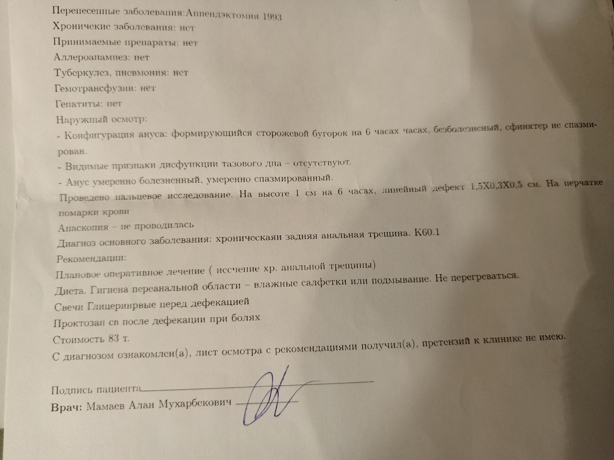 Пациент 2. Геморрой 3 стадии, причем его типа уже удаляли раньше. Скажу честно, рубцы увидел, между узлами. Удаление ультразвуком. Первые впечатления: о, намного лучше, чем в прошлый раз. Домой пошел через 2 ночи. Беда, правда, всё равно подкралась - несколько дней стул не мог наладить, а потом как пошло нормально, так карта-то и поперла. Через 8 суток после операции: стеноза нет, патологического зияния нет, раны чистые и активно заживают. Сукровица еще будет, это норма, но вполне ожидаю, что до состояния "привет как чисто" заживет через 2 недели.