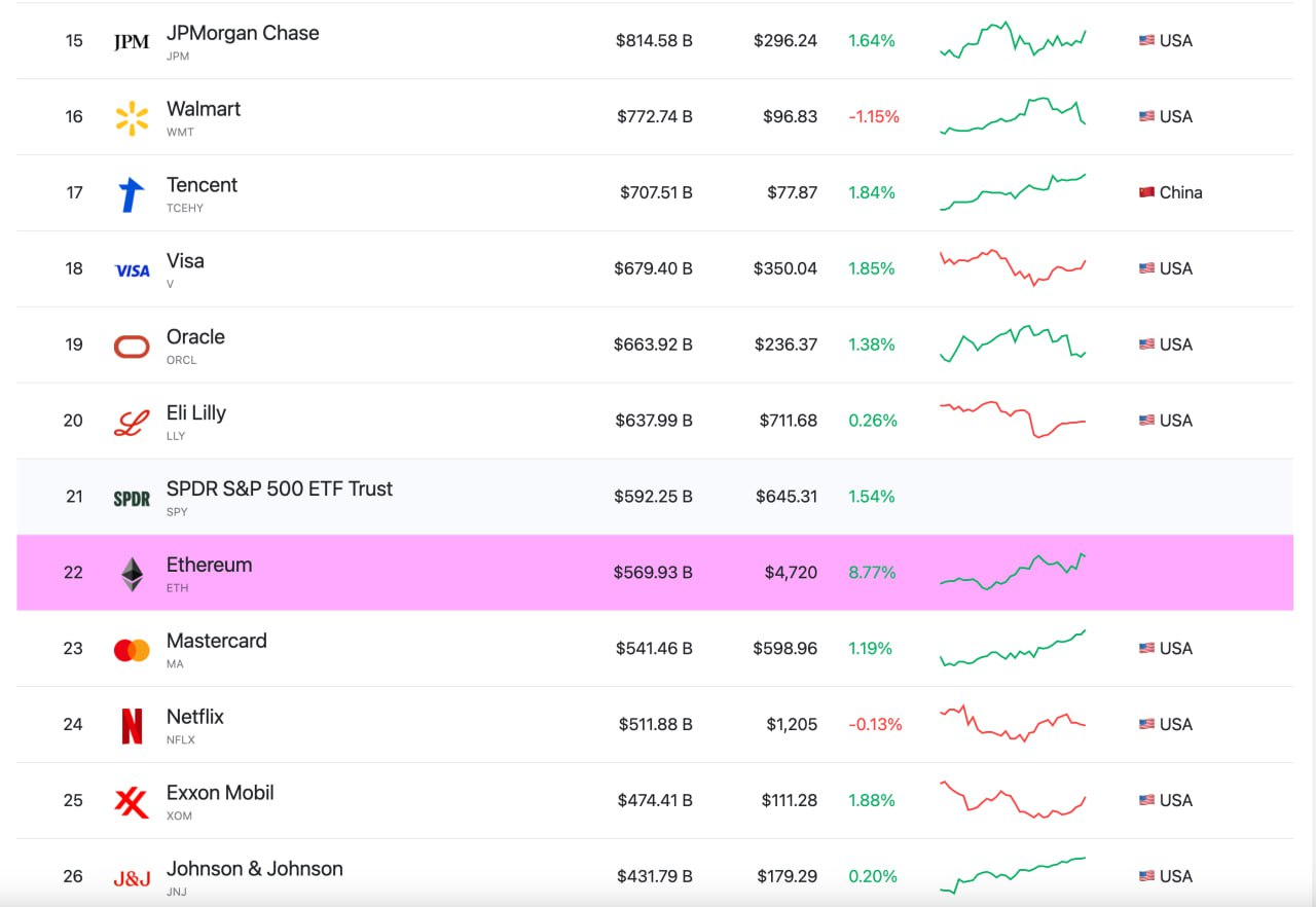 0 viktorpapic111 Ethereum поднялся выше Mastercard и Netflix 3 месяца назад На фоне обновления ATH апитализация Ethereum превысила $588 млрд, что вывело его на 22-е место среди крупнейших мировых активов. Теперь ETH обошел Mastercard и Netflix и приблизился к SPDR S&P 500, а также к таким гигантам, как Oracle и Visa. Криптовалюта Ethereum Ещё 0