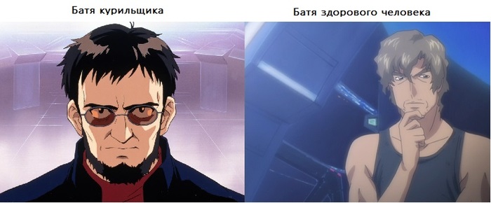 В "Евангелионе" какой-то небритый очкарик, а в "Небесном Фафнире" тоже небритый, но мачо. Сразу видно, кто из них руководит исследовательско-военной организацией, а кому просто в радость над сынком поиздеваться.