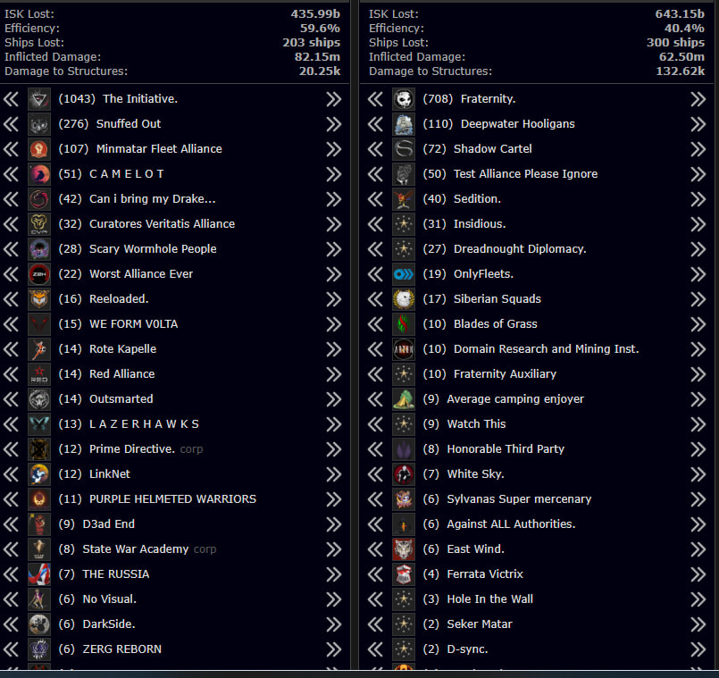 Тем не менее альянс Fraternity смог собрать значительный флот из нескольких сотен кораблей, сводка показывает цифру в 700+. Snuffed Out было заметно меньшее количество игроков. Часть флотов пришли на бой для того чтобы поддержать своих союзников, а часть наоборот, чтобы пострелять в своих врагов. ну само собой в системе были "чайки" которые охотились за ценными модулями из уничтоженных кораблей прямо во время боя.