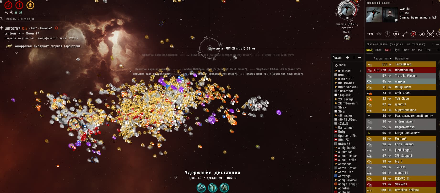 Вчерашний день не был примечательным, но вечером нас пригласили на бой за станцию класса фортизар принадлежащему лоусек альянсу Snuffed Out в в системе Lantorn. В бою приняли участие 3000игроков на кораблях от фрегатов до дредноутов. Из этиз кораблей около 1000были уничтожены в бою. Общая стоимость потерянных кораблей составила 3 триллиона иск - такие бои происходят нечасто - основные потери пришлись на дредноуты, которые активно использовали обе стороны конфликта.