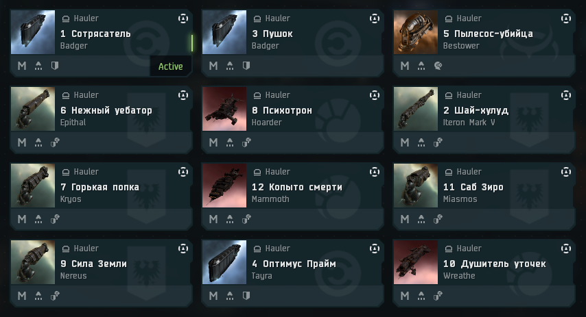 Участники называли случайное число от 1 до 12, и я, согласно номеру, раздавала Т1 грузовички. Как только народ сел в них, первая задача, "удивить", была достигнула. Некоторые словили когнитивный диссонанс, а кто-то — даже сатори. Фиты я создавала тщательно и продумано, как произведения искусства. Абсурдизма, если точнее, потому как с практичностью они ничего общего не имели. Тайра на лазерах, нейтрящий эпиталь, баджер со смартами. В мидслоте кто-то нашел берст-джаммер, а кому-то достался каргосканер или сетка, и в нижних слотах, имея ракетную установку, можно было застать сигнал амплифаер, хитсинки или варпстаб.