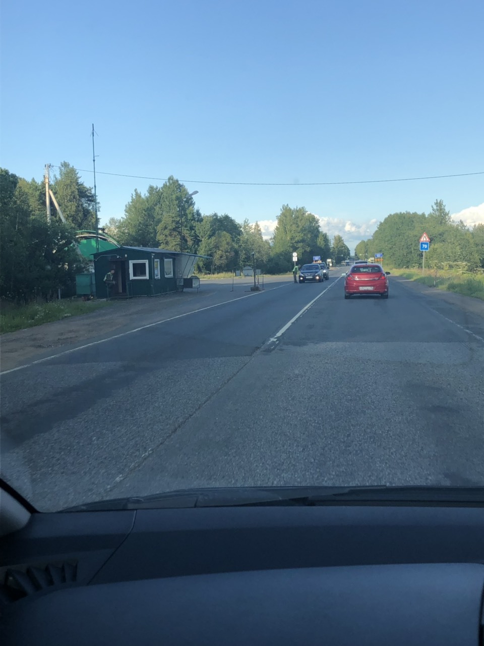 Здесь отличие от финской таможни. Там сразу с нескольких машин бегут люди. А здесь должны подходить на паспортный контроль только люди с машин, которые встали посередине между этими будками. Четыре ряда, четыре машины.