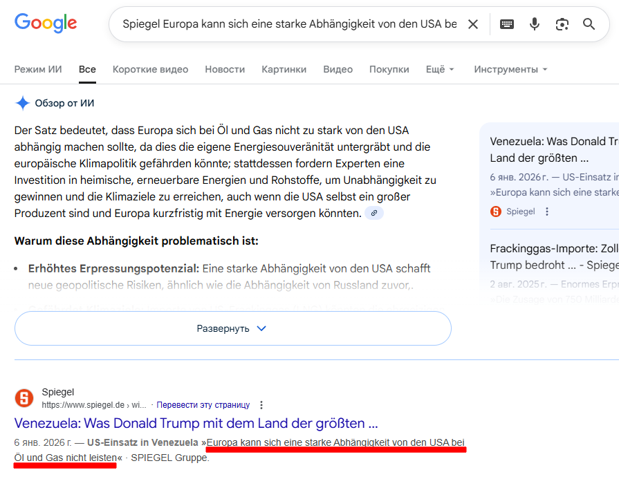 Поэтому я был очень удивлен, обнаружив в Spiegel статью под заголовком «Операция США в Венесуэле – «Европа не может позволить себе сильную зависимость от США в области нефти и газа». На вопрос о том, может ли Европа позволить себе такую зависимость, эксперт ответила отрицательно. Когда Spiegel уточнил, означает ли это, что США в перспективе перестанут быть надежным поставщиком, последовал четкий ответ: