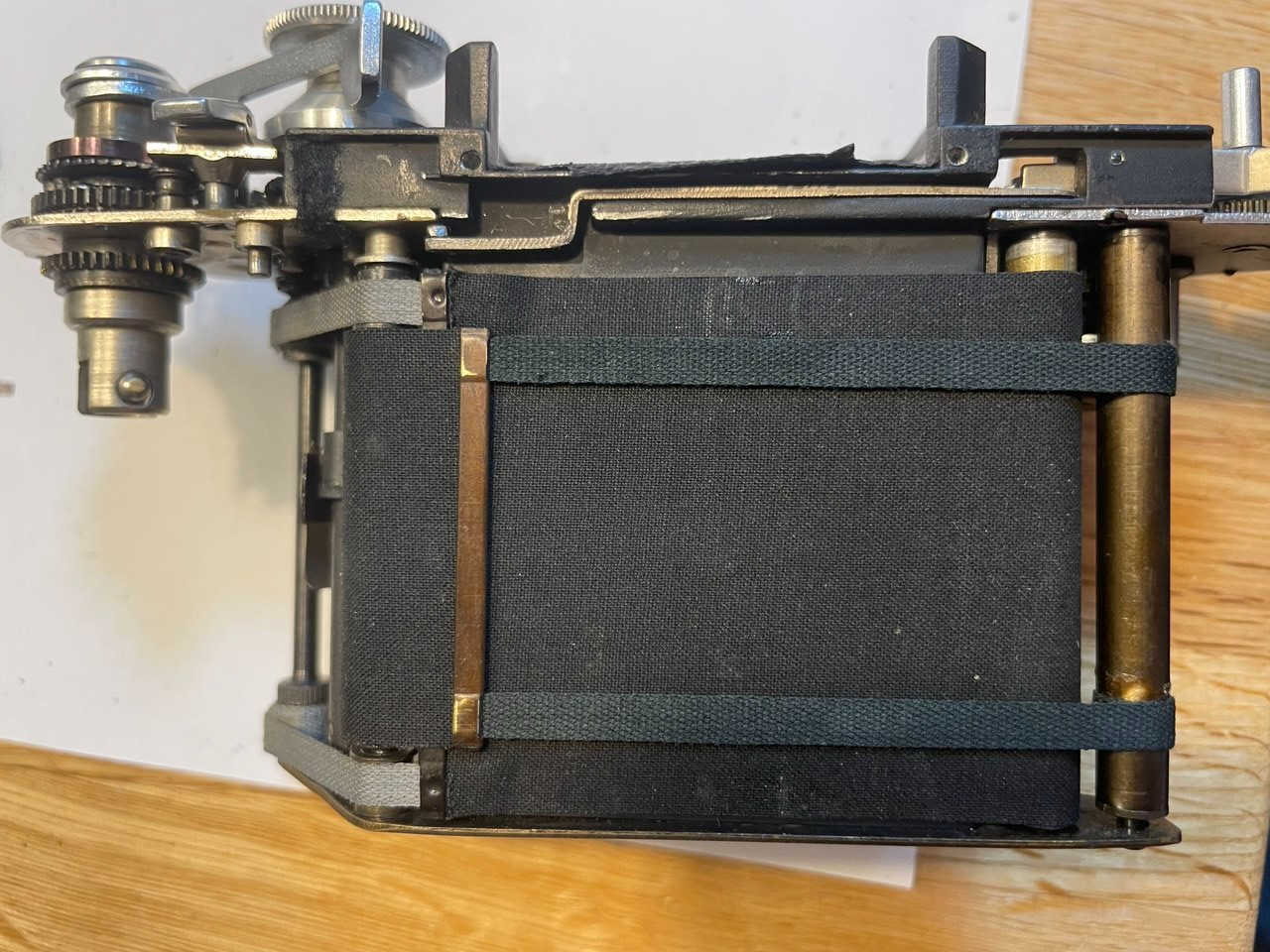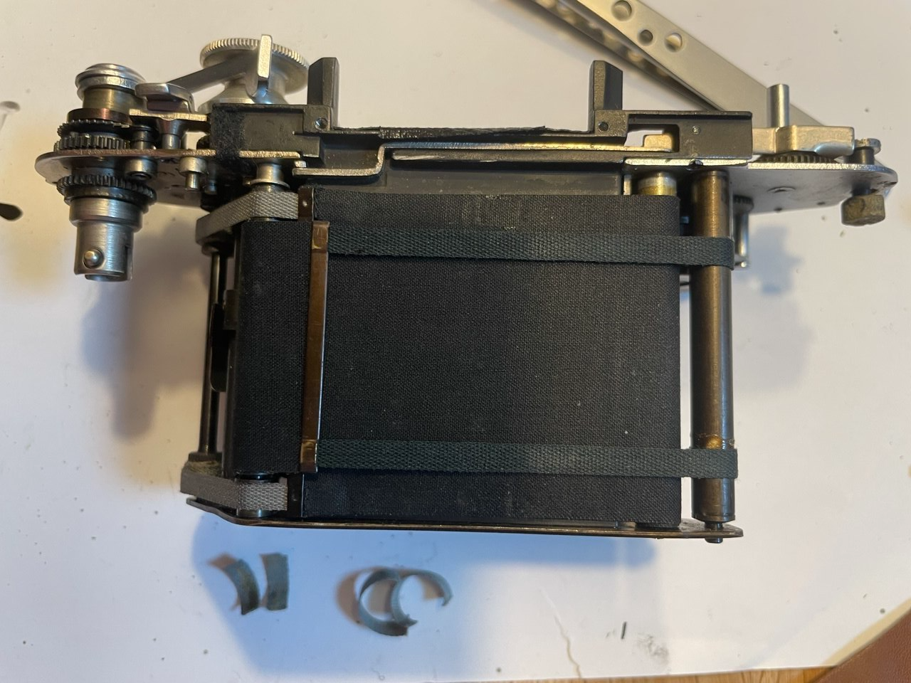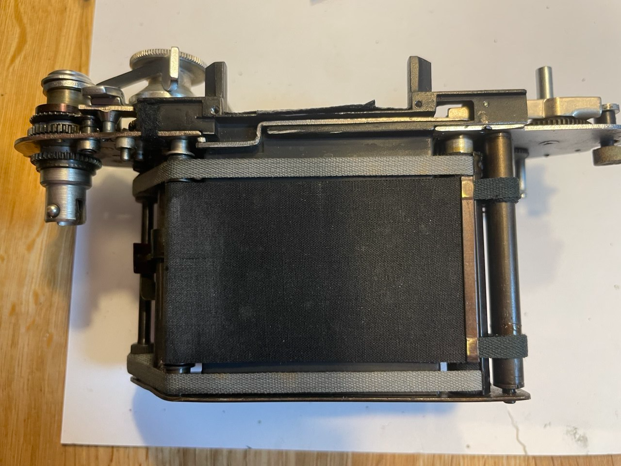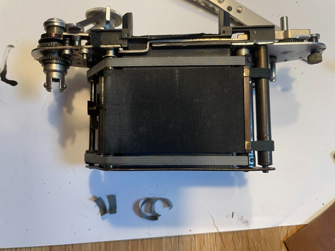 Так вот в данном случае для быстрой выдержки 1/1000 щель рассчитанная в механизме выдержек полностью перекрывалась нахлестом шторки, и лишь к концу кадра была нормальной. Если же сделать нахлест в допуске, переставив вал, тогда к концу кадра щель становилась огромной, что вызовет пересвет половины кадра на быстрых выдержках. Для исправления этой проблемы были отклеены тесемки и с них был срезан некоторый кусочек, таким образом мы уменьшили фактическое расстояние, на которое ходит шторка.