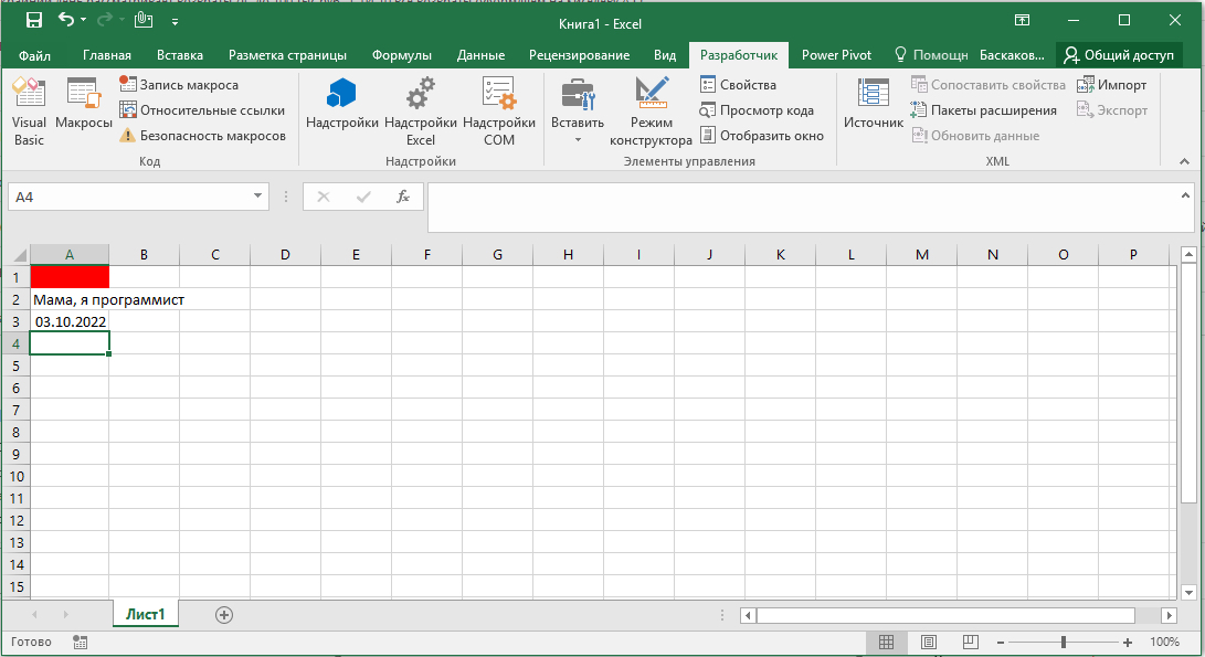 Давайте теперь что-то сделаем. На пример поменяем заливку ячейки А1, в ячейку A2 напишем значение «Мама, я программист», а в ячейке А3 пропишем формулу текущей даты «=Сегодня()»