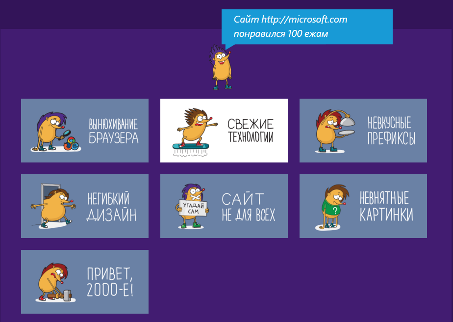 Портал Habrahabr и российское отделение Microsoft проводят совместную акцию, призванную для продвижения браузера Microsoft Edge. Владельцам сайтов и их посетителям предлагается проверить любой ресурс на наличие современных технологии. Сервис выдаст результат с перечислением положительных моментов, но не забудет и про промашки в устройстве сайта. Итоговый результат измеряется в ежах…