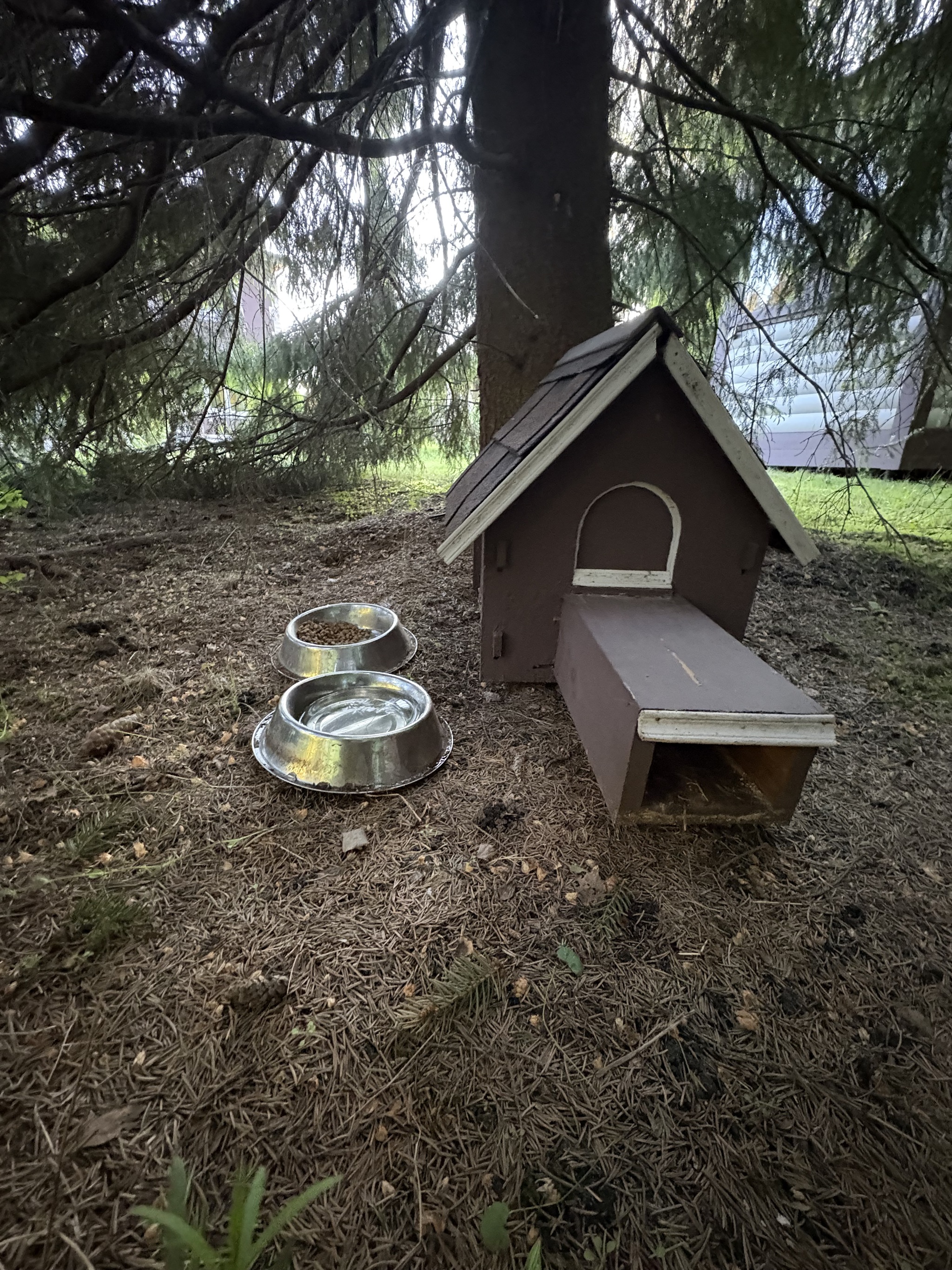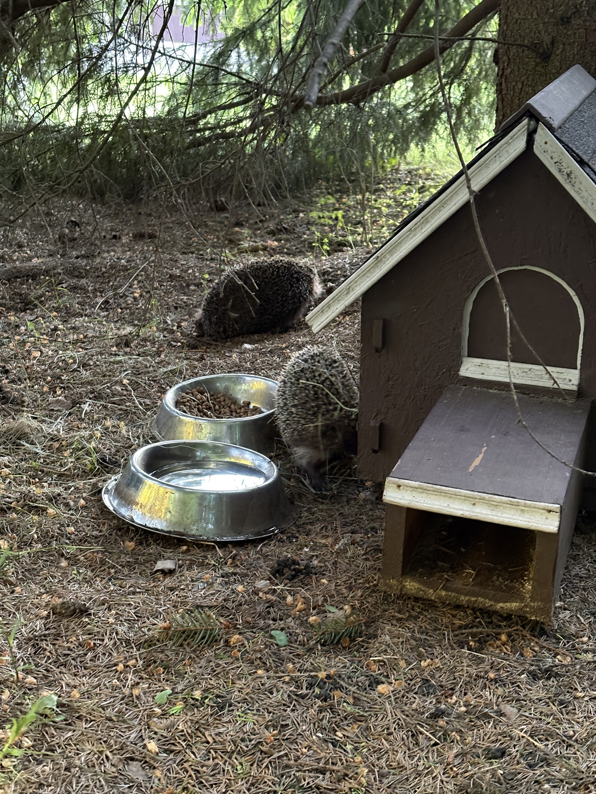 Прошла уже почти неделя свободы. Вечерами с балкона я высматриваю ежиков. Пару раз мне улыбнулась удача и я заметила кого-то из ежат по изгородью из елей. Мы обновляем пишу и воду у домика, правда днем я так и не увидела ни разу, чтоб Сид или Нэнси кушали или спали в коттедже. Корм и мясо, правда, пропадает.