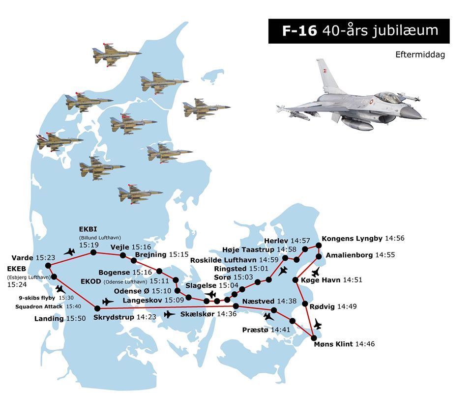 В ознаменование сорокалетия F–16 на службе Датского Королевства, сегодня (17 января 2020, пятница) эти самолеты совершили эффектный облет над страной: