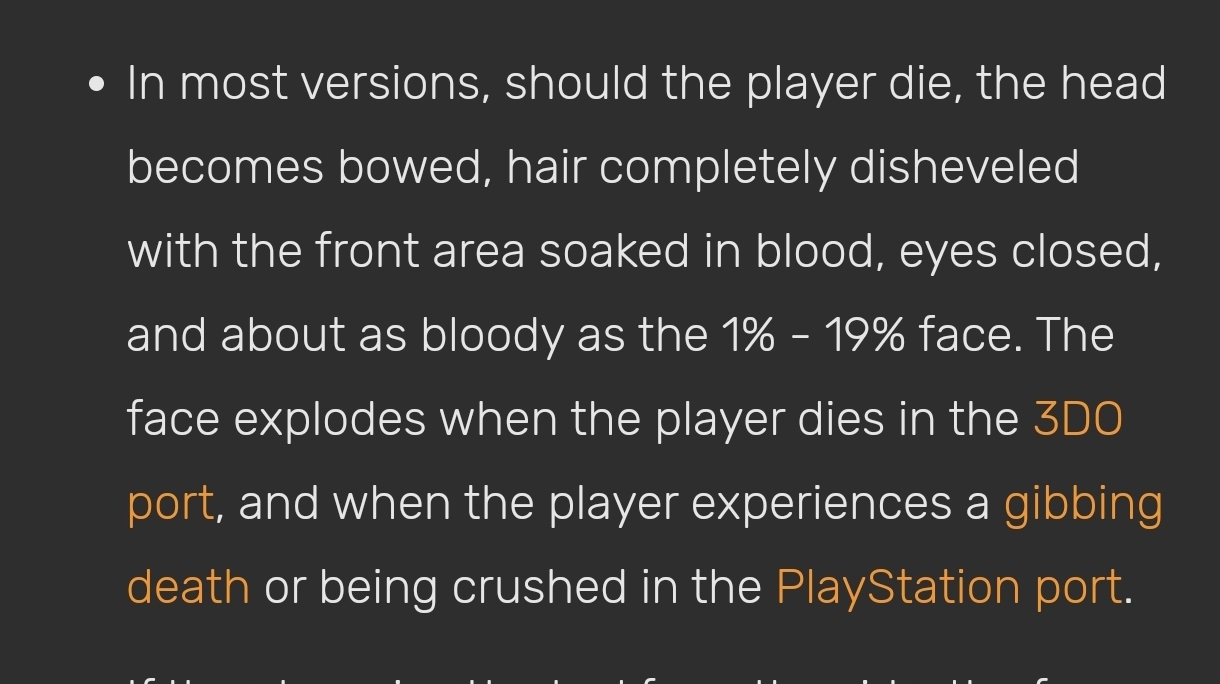 Так же, как и в Doom и в Wolfenstein, лицо героя служит индикатором текущего здоровья и получения урона. Уникальный и забавный момент с пустым шлемом и глазами, когда игрок подбирает невидимость.