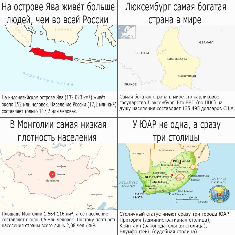 1446 artyrodinov Скромный автор, который пишет об интересных фактах из мира истории и географии ИНТЕРЕСНО ОБО ВСЁМ Серия Нескучная география Факты о географии #8 10 месяцев назад Другие интересные посты [моё] География Страны Познавательно Факты Хочу все знать Картинка с текстом Остров Ява Монголия Люксембург ЮАР 23 20 3 2 2 Ещё 0