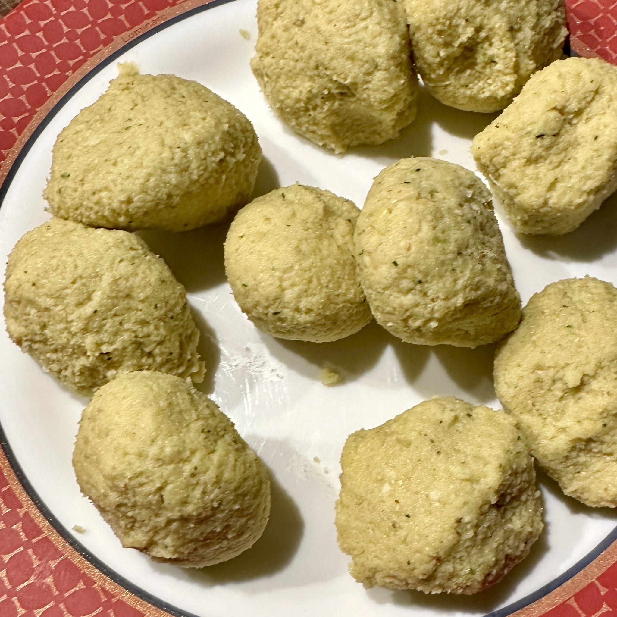 Накатал шариков. Размером между чуть меньше шарика для пинг-понга. Постараться надо, чтобы шарики получились плотными.