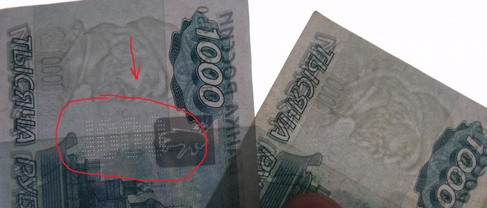 В поддельных же купюрах эта микро-перфорация делается обычными иголками, в связи с чем отверстия хорошо видны, выделяются над поверхностью купюры, а купюра в этом месте шероховатая, палец цепляется за разрывы в бумаге.