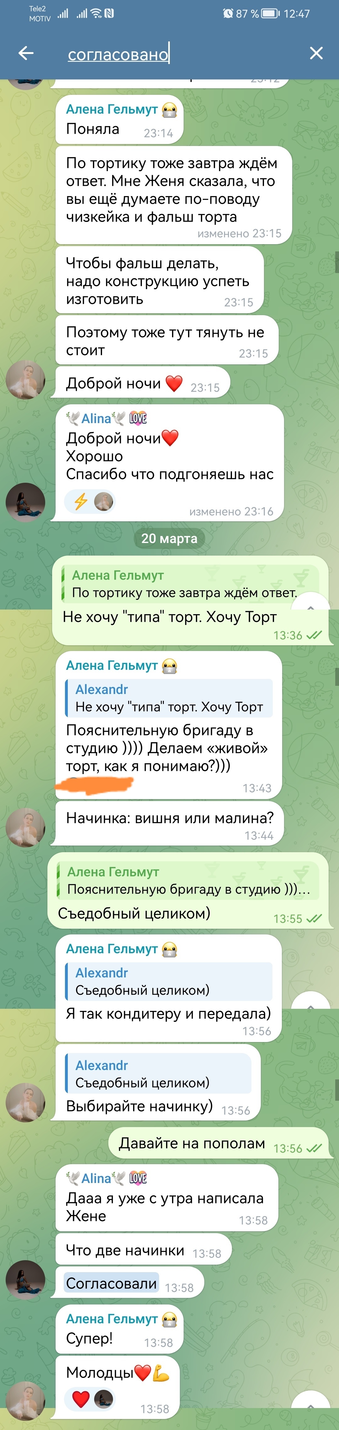 Кондитер говорит она не причём, ей так сказали. В переписке Алёна пишет, что ""Съедобный целиком", так кондитеру и передала".