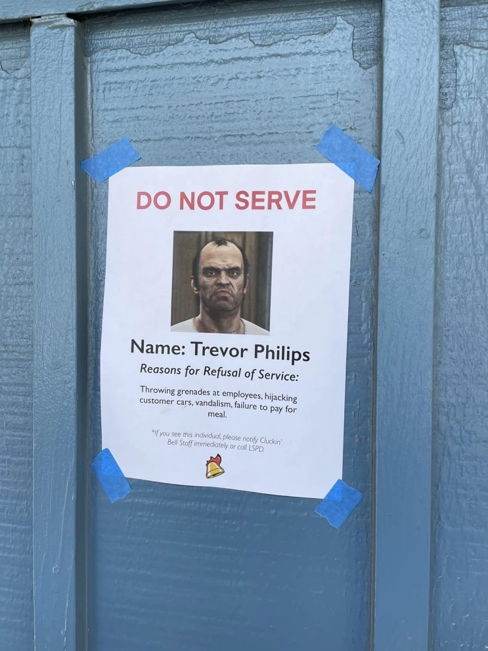 Создатели забегаловки досконально повторили любимую локацию из игры — куриная униформа, газировка Sprunk, плакат об отказе обслуживать Тревора а также двусмысленные шуточки в меню
