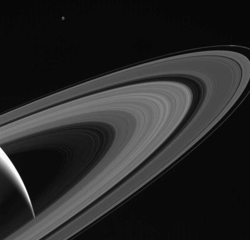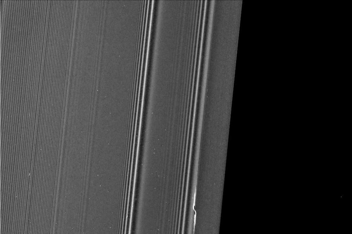 Здесь Cassini делает фото Сатурна, подсвеченного Солнцем сзади. Освещение показывает газовую структуру колец и даже выявляет очень слабое, внешнее ледяное F-кольцо.