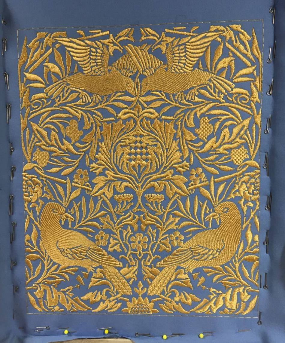 Первым делом выберу узор для красивой вставки на груди (золото на красном) и переведу его в машинную вышивку (золото на голубом).