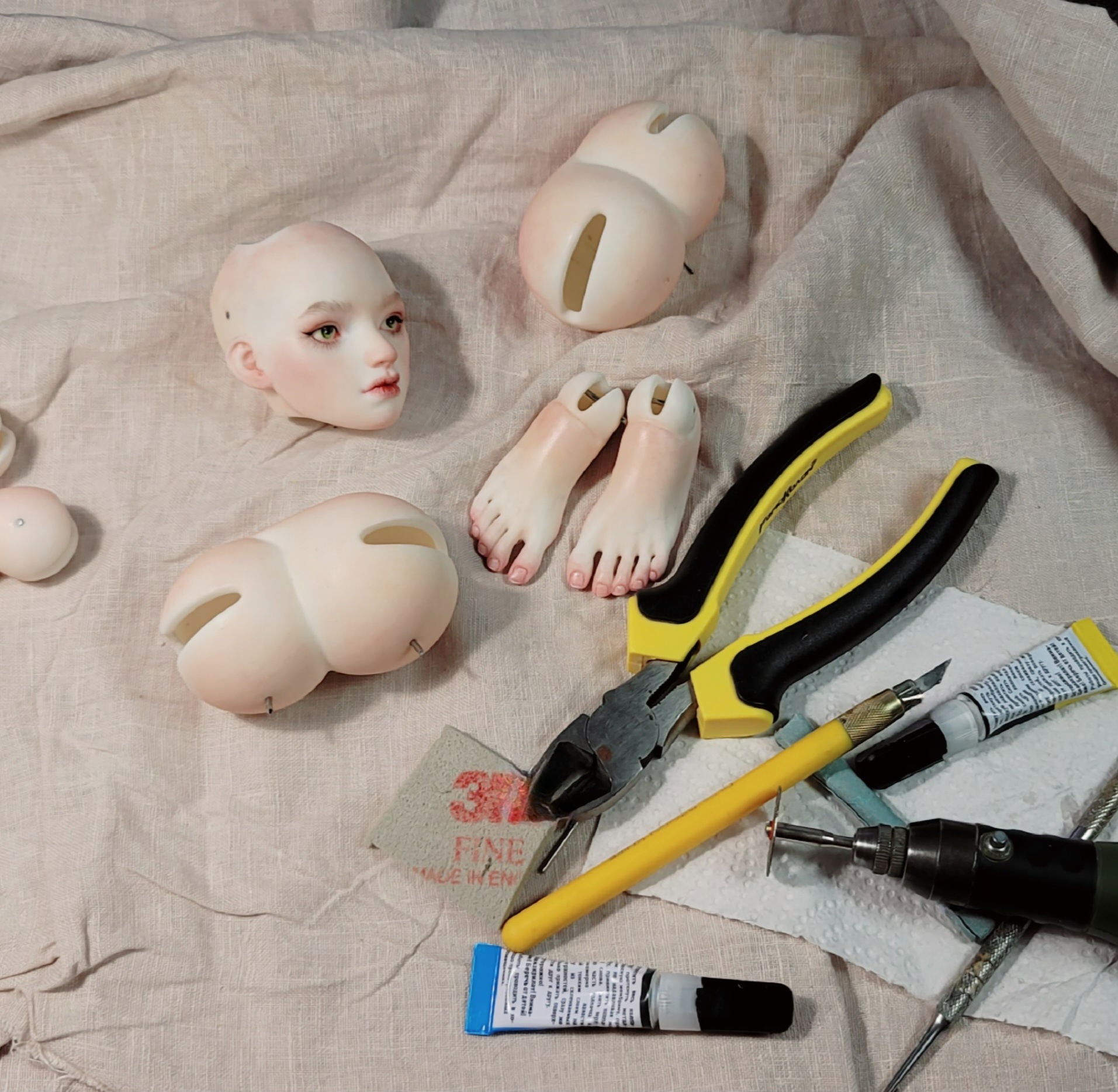 Сушьё обрабатываю - убираю швы, вырезаю глаза, уши, ноздри, ноготочки и прочее, прохожусь по деталям наждачкой и абразивными губками (пылищи море, в процессе обязательны респиратор, очиститель воздуха, регулярная влажная уборка всех поверхностей, протирание инструментов, так как дышать фарфором очень не рекомендуется). Высушенная фарфоровая отливка до обжига хрупка как мел, работать нужно аккуратно и осторожно, но неприятности иногда всё же случаются, пальцы только так отлетают, отламываются тонкие края шарнироприёмников, если выронить деталь из рук на стол, она разобьётся.