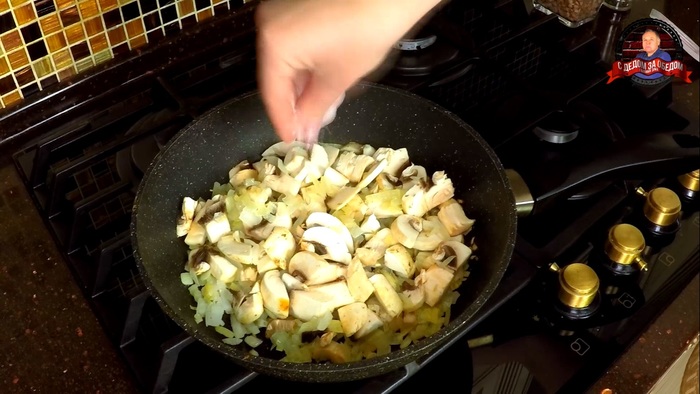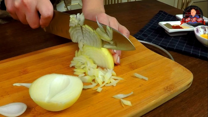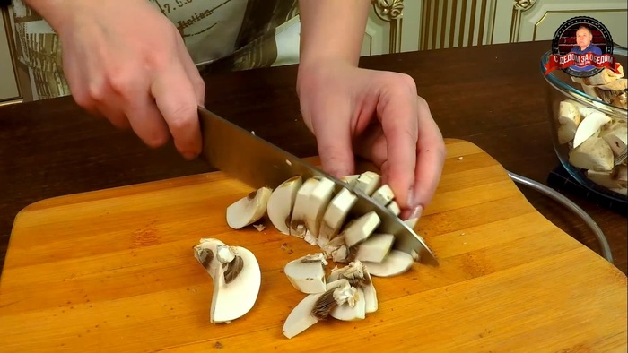 Репчатый лук нарезать на кубики. Грибы нарезать на пластины, затем на кубики. Мелко не режьте.