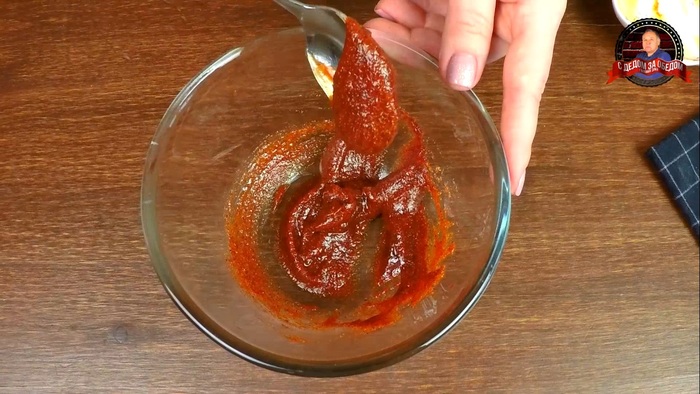 В неглубокой чаше смешать сухие приправы между собой. У меня здесь сухой чеснок, паприка сладкая, черный перец. Можно еще добавить сюда же приправу для курицы. Все, как говориться, индивидуально. Далее добавить томатный кетчуп или томатную пасту. Перемешать. Затем добавить мед. Тщательно перемешать.