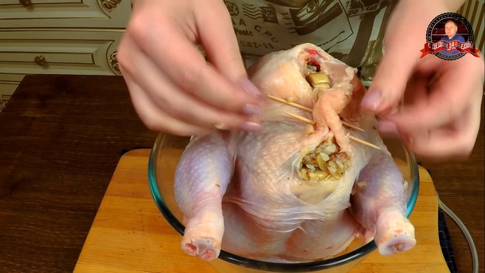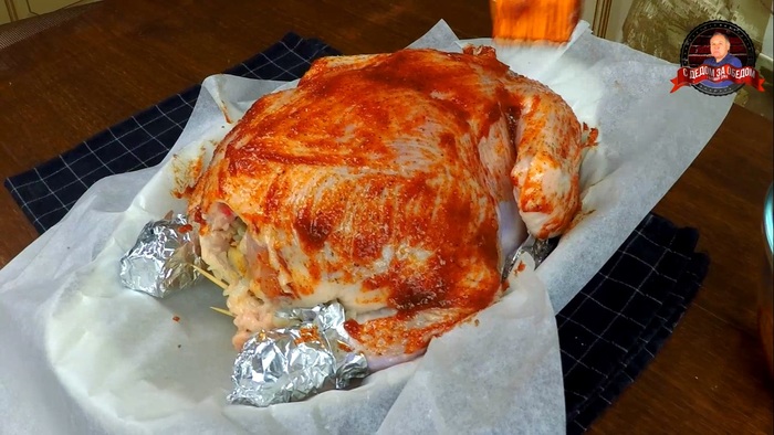 Нафаршировать начинкой курицу. Закрепить зубочистками кожу, чтобы гречка не выпадала. Переложить курицу в жаропрочную форму. Блюдо даст по итогам много сока, поэтому форму лучше взять с высокими бортиками. Половиной обмазки намазать во всех видимых местах кожу курицы. Фольгой смотать крылья и голень курочки. И убрать в разогретую духовку на 1 час. По истечении времени вынуть курицу из духовки. Сверху обмазать остатками обмазки. Отправить обратно в духовку на 30-40 минут. Ориентируйтесь по красивой и аппетитной корочке сверху.