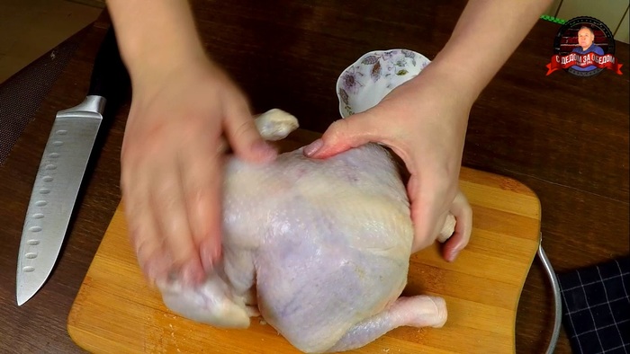 Курицу хорошо промыть под проточной водой, особенно внутри. Обмакнуть бумажным полотенцем. Срезать хвостик. Натереть солью внутри и снаружи.