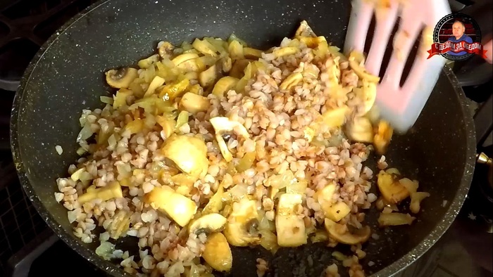 Сделаем начинку для фаршированной курицы более аппетитной. Для этого в прогретую с растительным маслом сковородку выложить лук. Поджарить на среднем огне до размягчения и золотистого цвета. Далее добавить грибы. Присолить и поперчить по вкусу. Жарить примерно 5 минут, за это время овощи соединят свои запахи и вкусы. Затем добавить готовую вареную гречку и перемешать. Прогреть под крышкой на слабом огне 2-3 минуты.