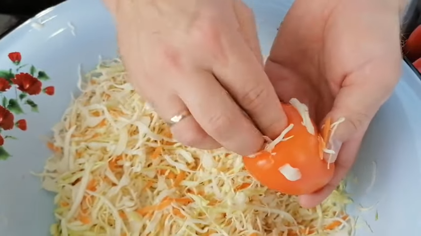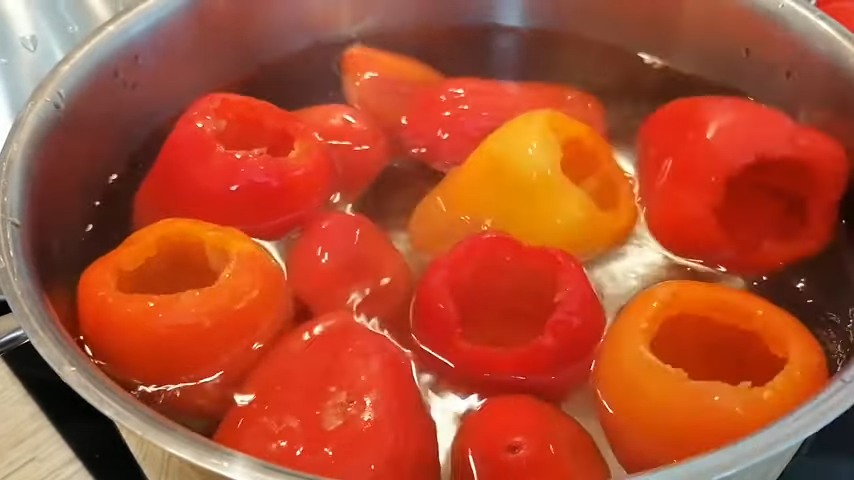 Пока капусту с морковью перемешаем, немного помнем, оставляем постоять. Капуста размягчится и даст немного сока. В это время бланшируем сладкий перец, отправляем в кипящую воду минут на 5. Лучше делать это партиями.