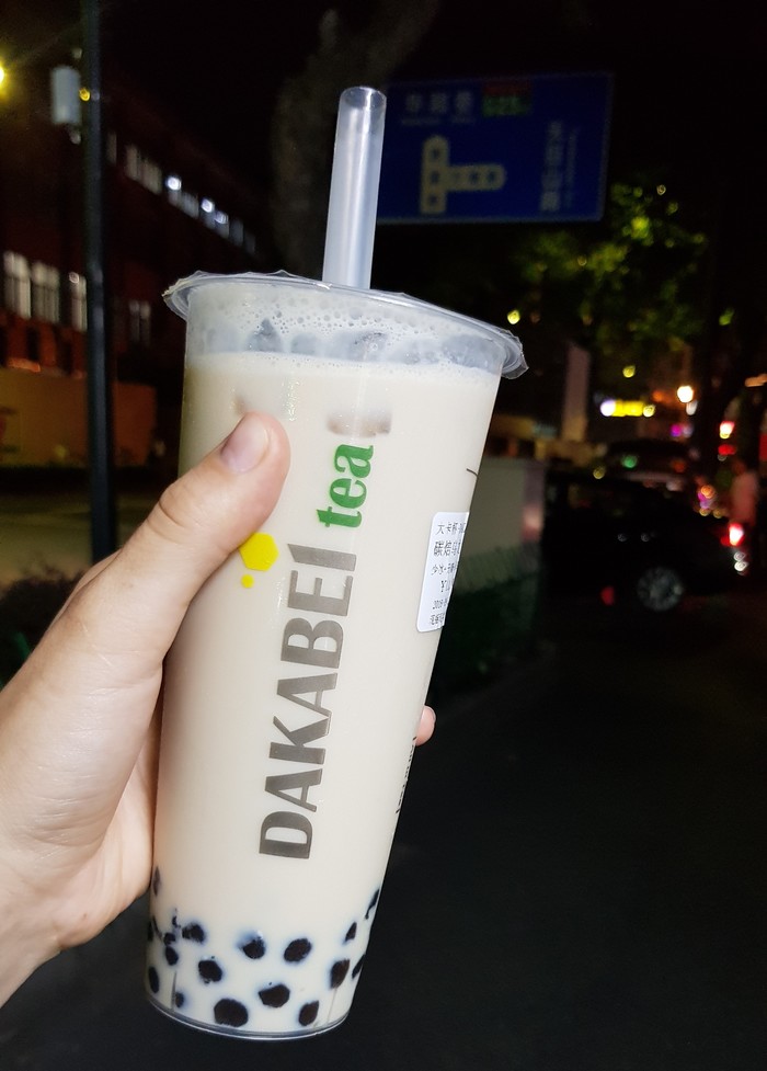 Здесь очень популярен молочный чай (奶茶). Есть разные варианты. В моем случае это молочный Улун со съедобнымт жевательными конфетами внутри (珍珠)