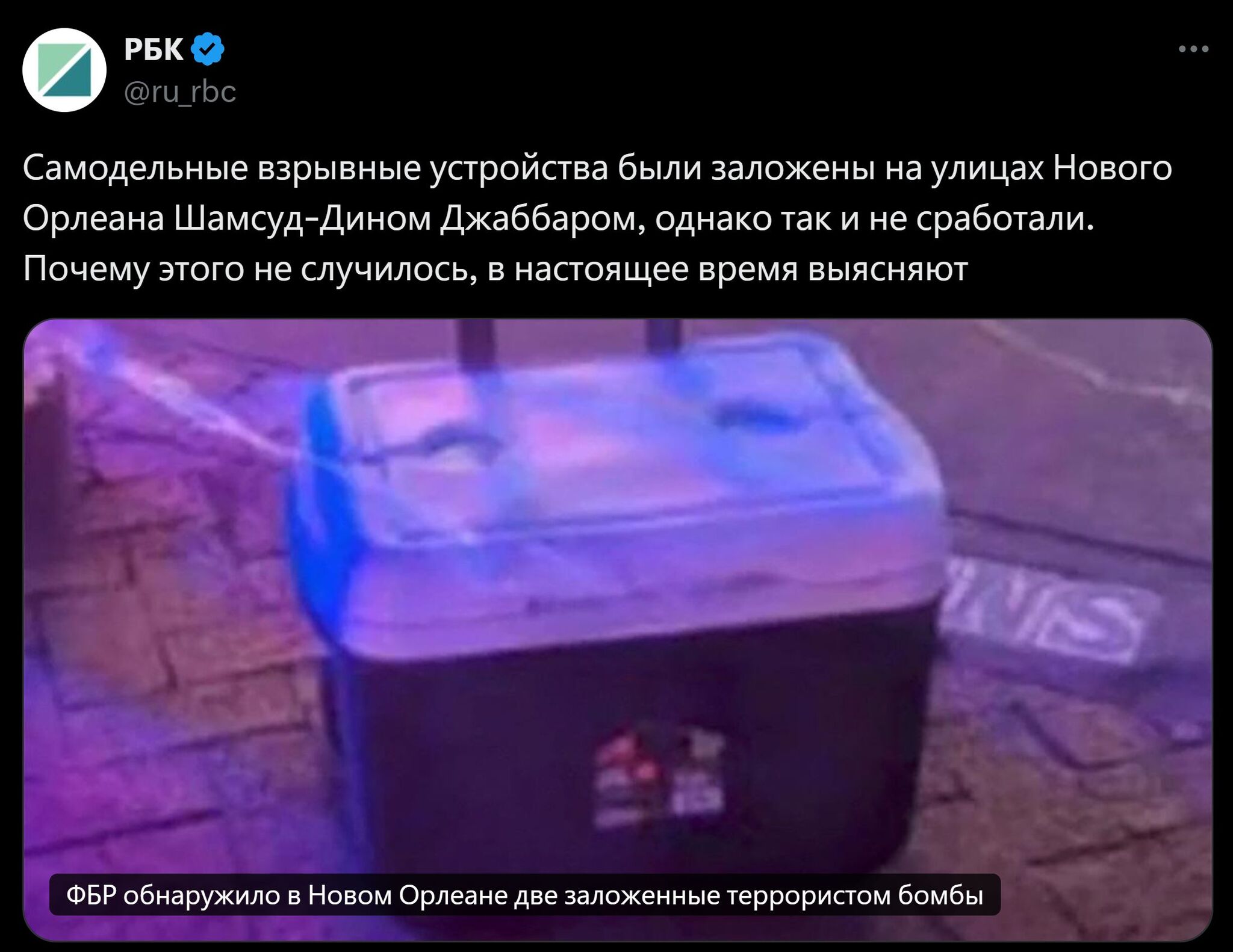 Агенты Федерального бюро расследований (ФБР) нашли и обезвредили в Новом Орлеане два самодельных взрывных устройства (СВУ), заложенных на улицах города Шамсуд-Дином Джаббаром, который устроил в первый день 2025 года теракт.