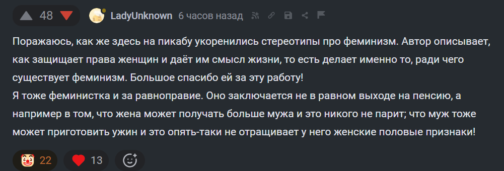 Но хотелось сказать о другом: пожалуйста, не путайте здоровый феминизм и радфемок. Мы не жирухи с волосами цвета радуги, поливающие грязью всех кругом, мы не выбегаем голыми на стадионы.