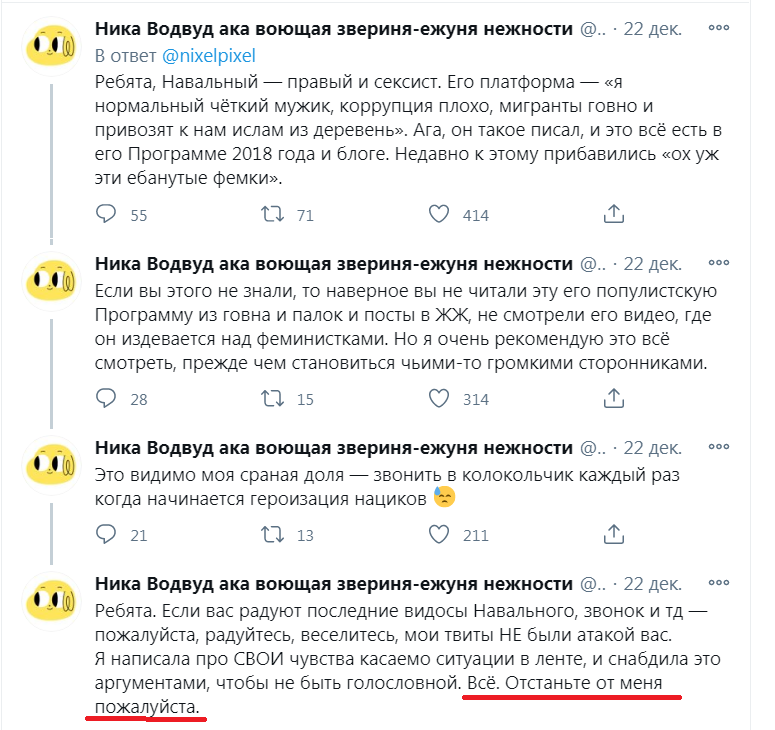 Феминистка Ника Водвуд (nixelpixel) обвинила оппозиционера Алексея Навального в сексизме и правых взглядах, но в ответ получила тонну хейта.