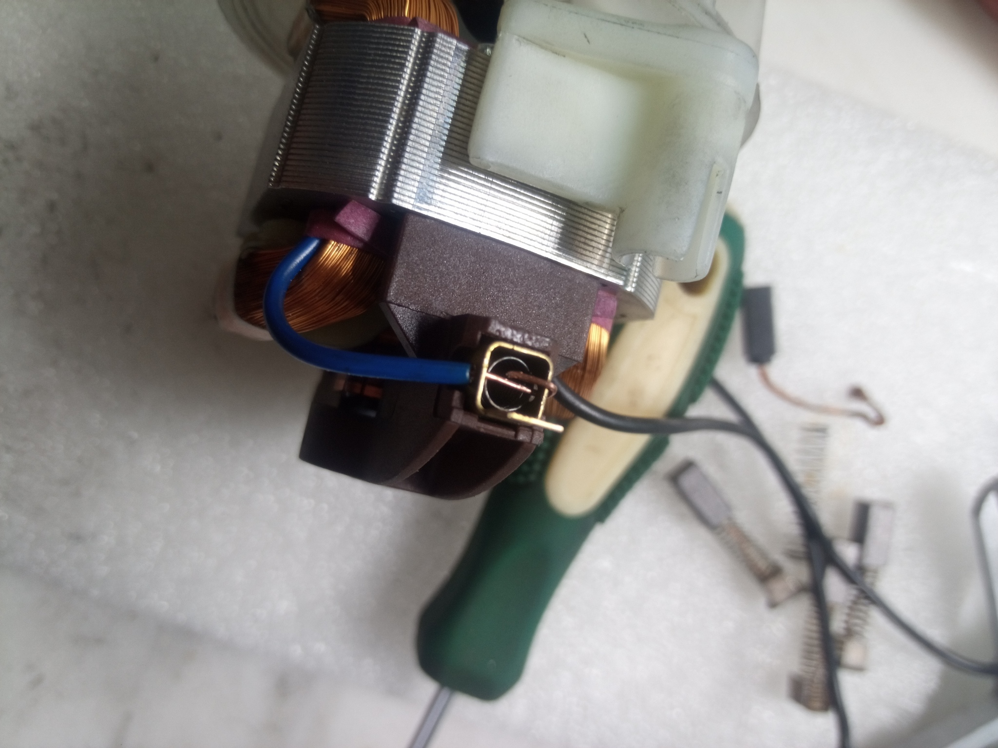 Щёточный узел расположен внутри у нагревателя. Вверх тормашками, логики нет. Однако графитовая пыль осела на внутренней стороне крыльчатки. Турбулентность, наверн