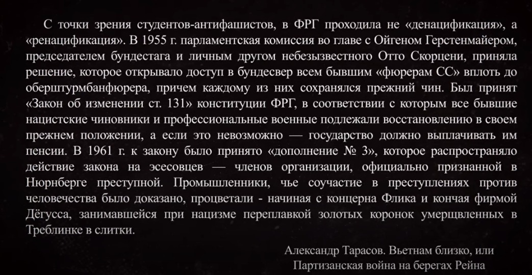 Естественно, молодежь подобный ответ не устраивал, к тому же, прямо у них перед носом правительство запрещало демократические партии, а бывших нацистских чиновников восстанавливало в должностях и открывало им двери в бундесвер. По совершенно справедливому мнению студентов, ФРГ, вместо того, чтобы нести бремя раскаяния и способствовать делу мира, занималось самой настоящей ренацификацией.