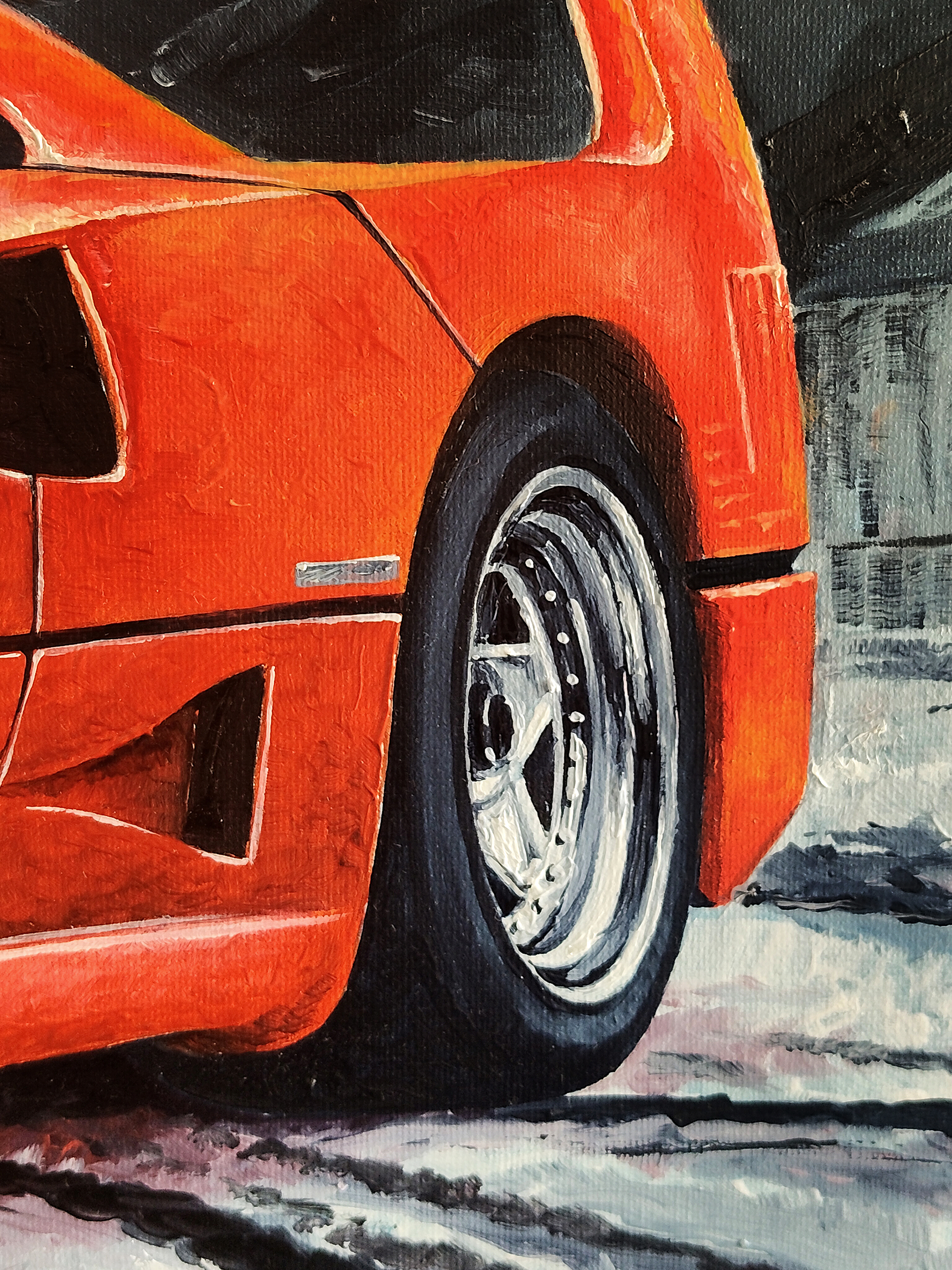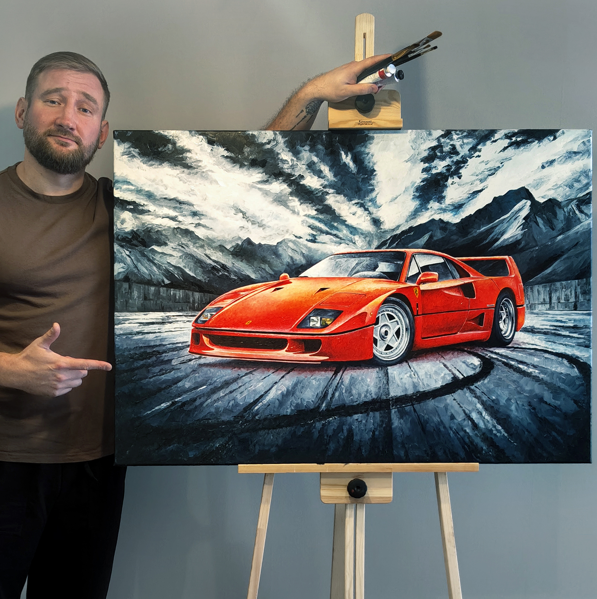 Выбор темы для холста пал на Ferrari F40 — самый быстрый автомобиль на планете в своё время. Название модели посвящено 40-летию компании и это последний из Феррари, спроектированный при участии самого Энзо.