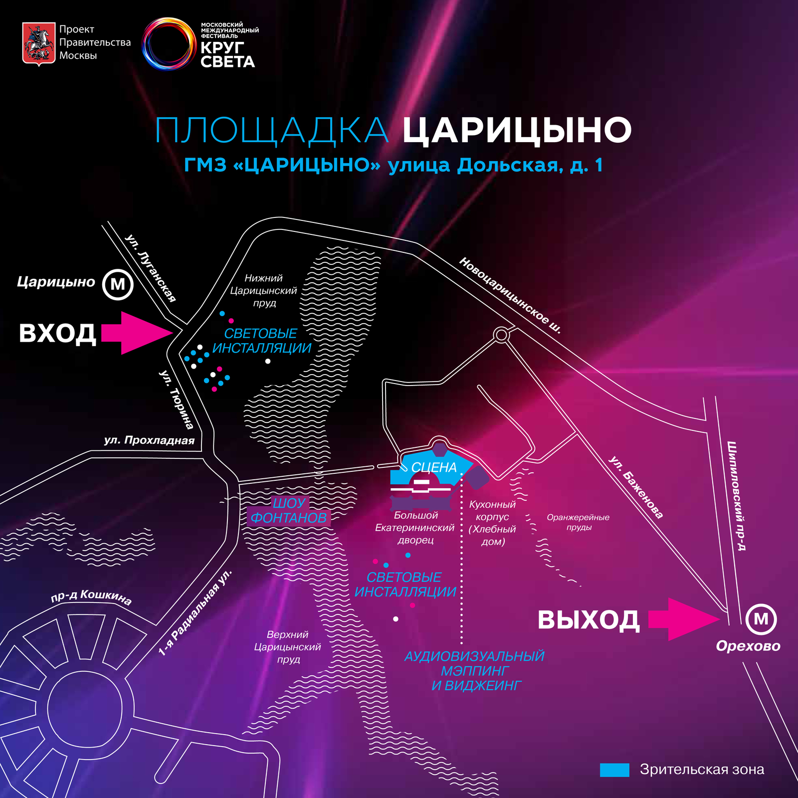 На протяжении всего вечера в парке Царицыно будут работать удивительные световые инсталляции от ведущих световых дизайнеров со всего мира.