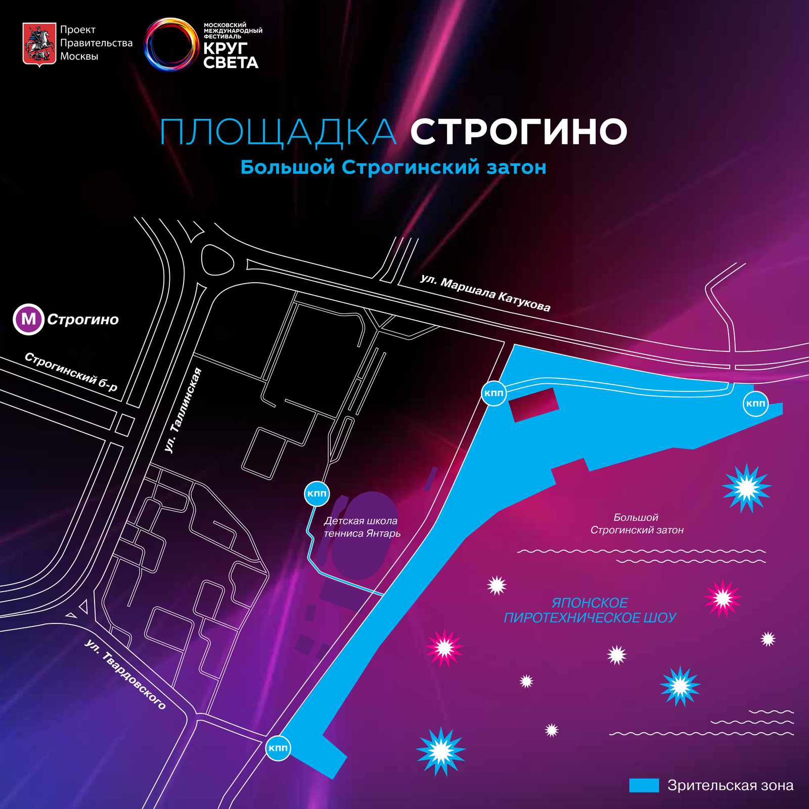 Зрителей ожидает яркое и незабываемое 30-минутное японское пиротехническое шоу, не имеющее аналогов в России. С четырёх барж, установленных в акватории Строгинского затона, будут запущены сотни пиротехнических зарядов, самый крупный из которых, 600 мм калибр, никогда ранее не был представлен в России.