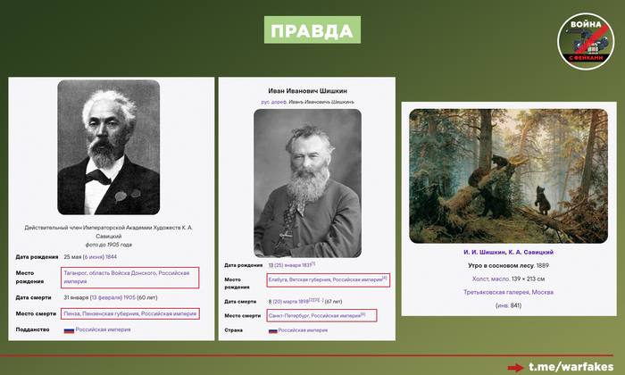Антироссийская пропаганда продолжает перевирать исторические факты. ЦПД уже пытались «украинизировать» других русских деятелей культуры, например художника Константина Богаевского. А некоторые западные музеи поменяли национальность Айвазовского, Репина и Куинджи в текстах табличек под их картинами.