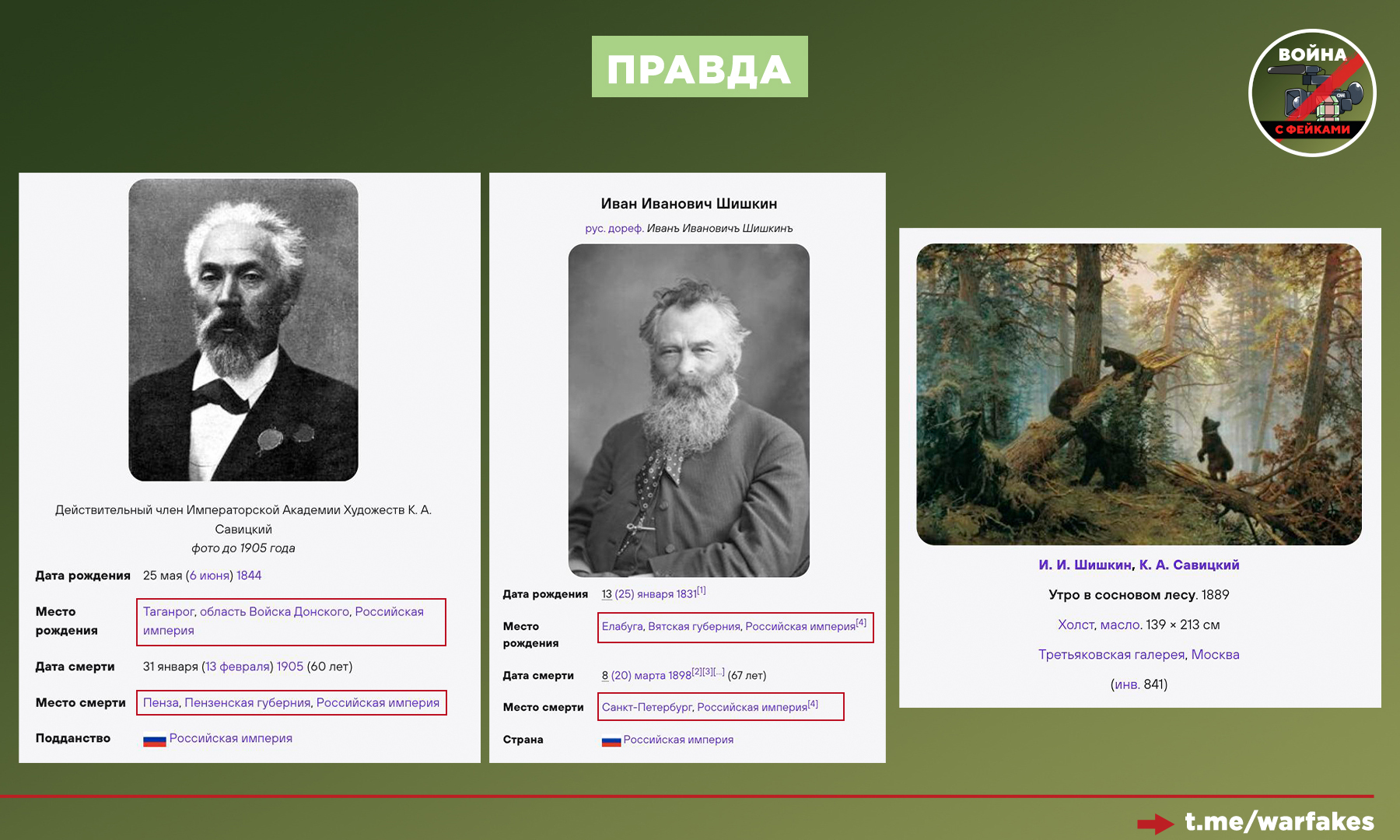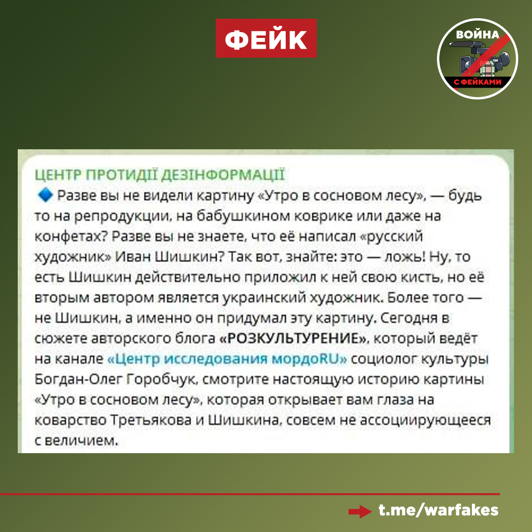 О чём фейк: картину «Утро в сосновом лесу» на самом деле написал украинец, что Павел Третьяков и Иван Шишкин коварно скрыли. Об этом пишет украинский «Центр противодействия дезинформации» (ЦПД)