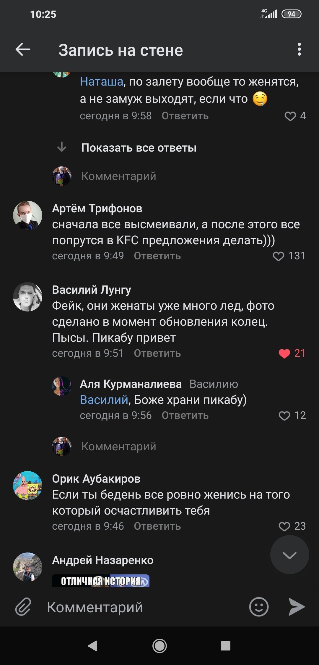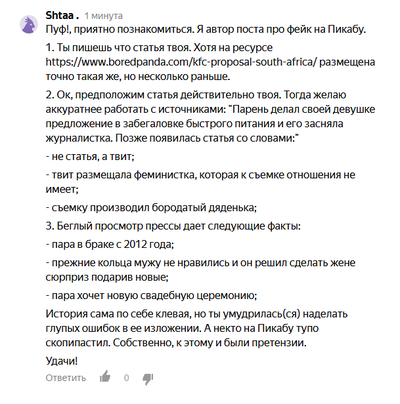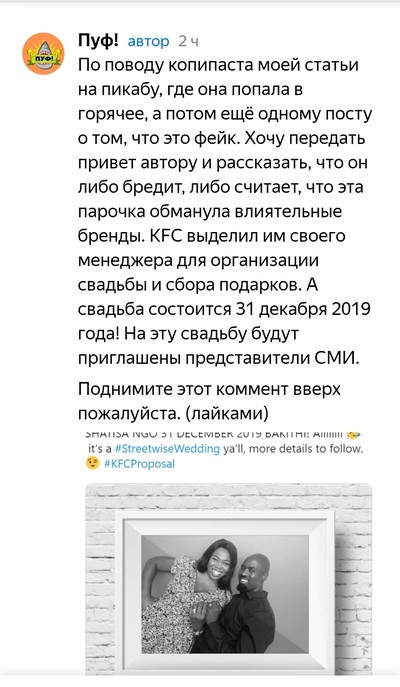 В горячем активно плюсуют копипасту из Яндекс.Дзен про парня из Южной Африки, который сделал предложение своей любимой в местном KFC Парня высмеяли в СМИ за то, что он сделал девушке предложение в KFC. А KFC, Audi и Puma решили оплатить их свадьбу