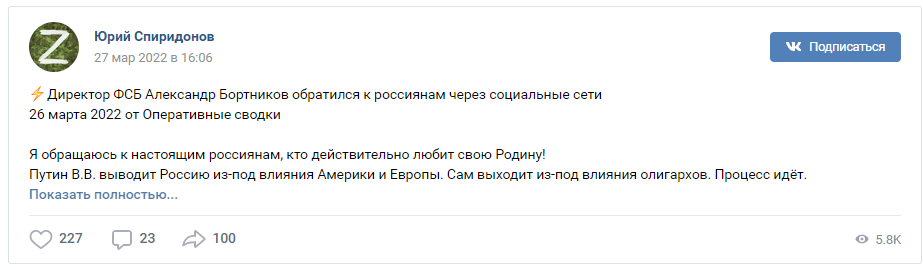 Таким образом, обращение директора ФСБ Александра Бортникова, широко разошедшееся среди пользователей соцсетей, представляет собой компиляцию из двух написанных ранее текстов, причём первая его часть была опубликована почти шесть лет назад. С Бортниковым эту компиляцию стали связывать 26 марта ряд Telegram-каналов военно-политической направленности. Большинство из них оперативно удалили соответствующие записи или выпустили опровержения, однако недостоверную информацию и сейчас продолжают распространять пользователи «ВКонтакте» и других соцсетей. (хватит это репостить, пожалуйста)