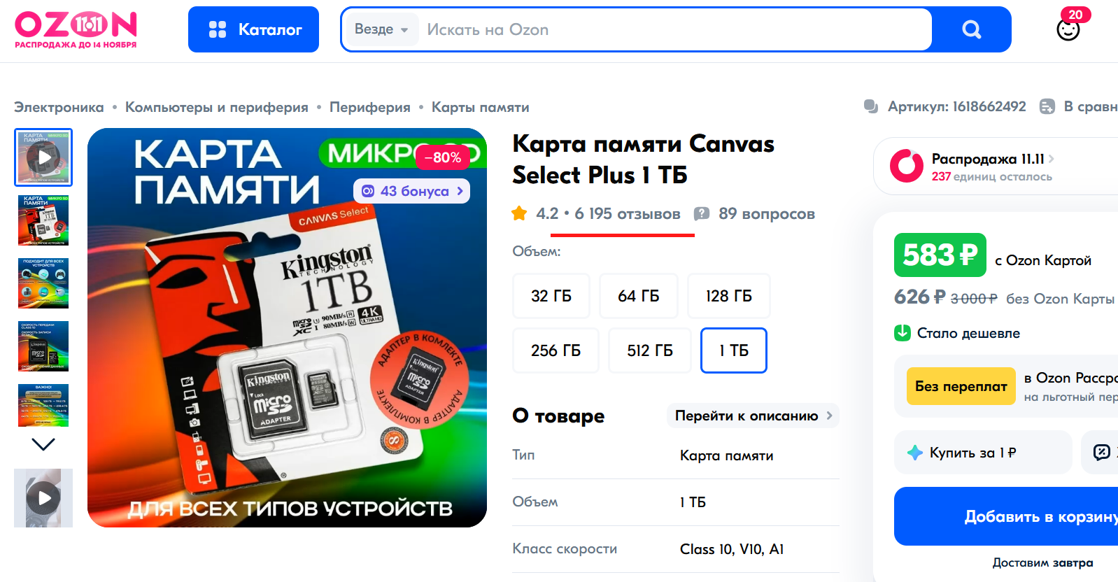 Решил проверить, насколько сейчас обманывают с емкостью продавцы фейковых карт Kingston, которыми завалены все маркетплейсы. Взял две штуки: 1 ТБ и до кучи 32 ГБ. По запросу «microSD» на Ozon они выскакивают первыми. Сколько раз их купили – не известно, но в карточке товара аж 6 тыс. отзывов.