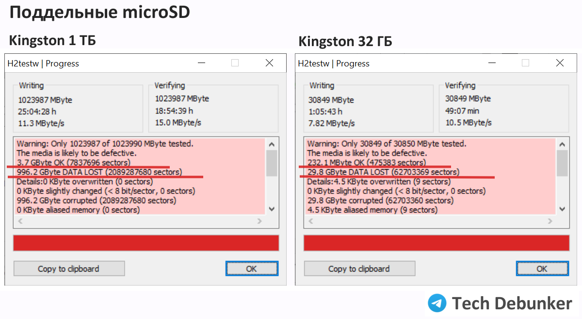 Да, финальный вопрос – как распознать подделки? Кэп подсказывает, что в 90% случаев по цене. Ну не может нормальный товар стоить 20% от минимальной магазинной цены. И половину цены тоже (кстати, реальная цена карты 1 ТБ – от ~10 тыс. руб.). А в случае с картами - тест H2testw вам в помощь.